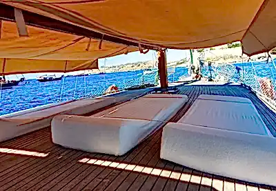Rahat edebileceğiniz ve gün boyu güneşin tadını çıkarabileceğiniz oldukça yumuşak minderlerimizde Bodrum Tekne Turunu konforlu bir şekilde sürdürebilirsiniz. Sizin için özenle seçilen malzemelerle hazırlanan lezzetli ikramları Bodrum Guletimizde tadabilmek ve keyifli bir yolculuğa çıkmak içim Eser'i keşfedin.Arayın, Yerinizi Ayırtın, Ücreti Tur Günü Ödeyin!
