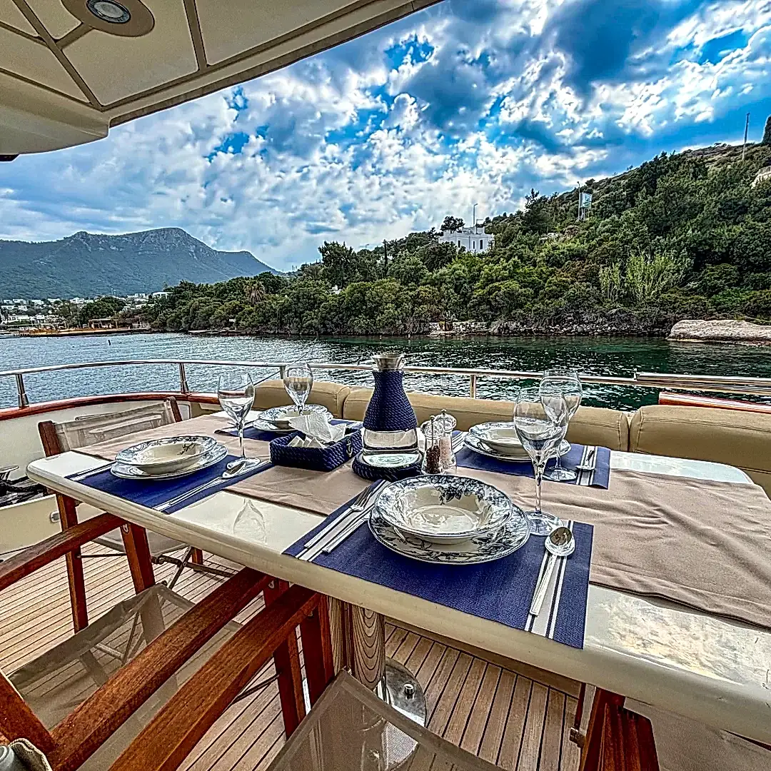 Özel teknemiz, geniş kullanım alanları ve modern donanımıyla misafirlerinizin rahatlığnı ve mutluğunu ön planda tutmaktadır. Oldukça geniş ve konforlu güneşlenme alanları, oturma grupları Bodrym özel yat turu deneyiminizi en üst seviyeye çıkarmaktadır. Sizler için özenle hazırlanan menüleri deneyimleyebilecek ve sonsuz bir tatil isteyeceksiniz. Bodrum’un bakir koylarında, denizin ortasında benzersiz anılar biriktirmek için bizimle iletişime geçmeyi unutmayın.