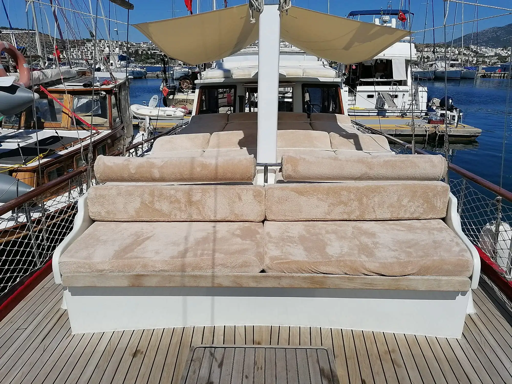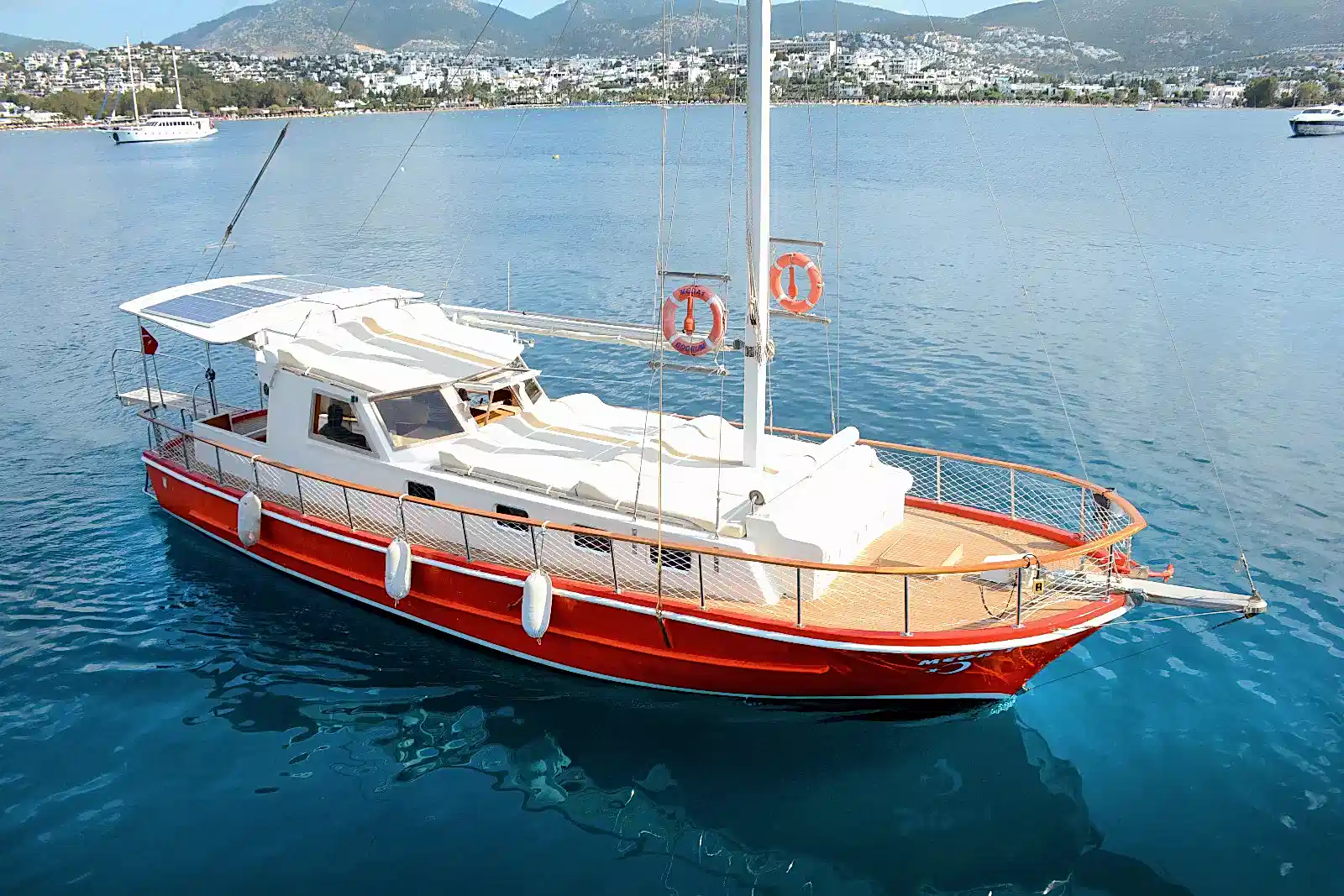 15 metre boyundaki Bodrum yapımı ahşap guletimiz yaz aylarının en konforlu ve eşsiz tatil seçeneğidir. Masmavi Bodrum Denizi ve muhteşem bakir koylarda bu ahşap guletimiz siz değerli müşterilerimize eşlik edecektir.