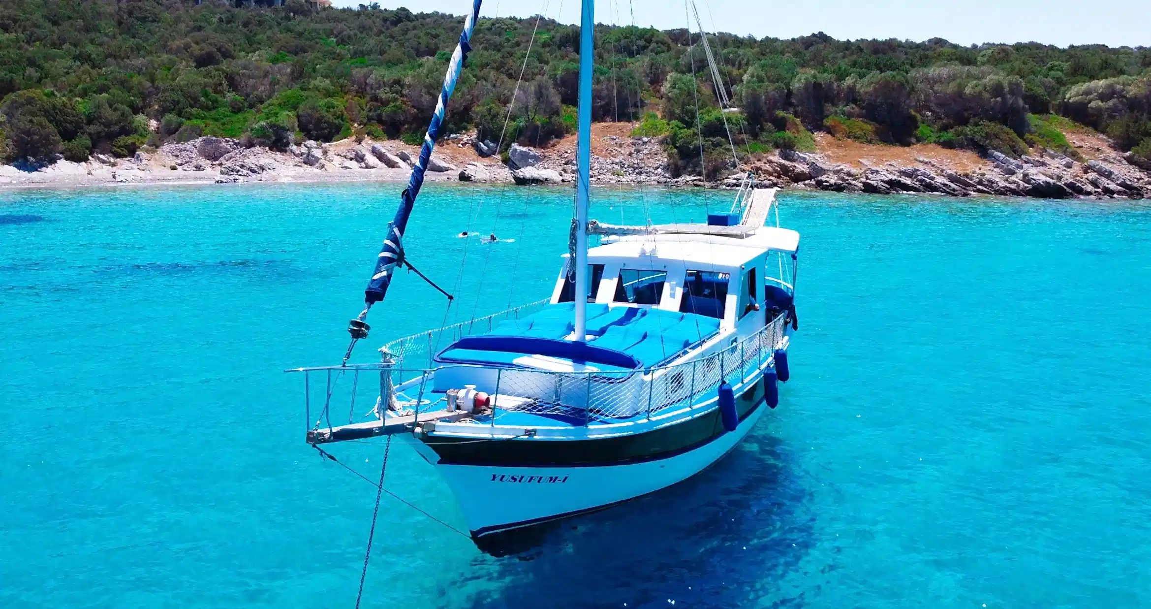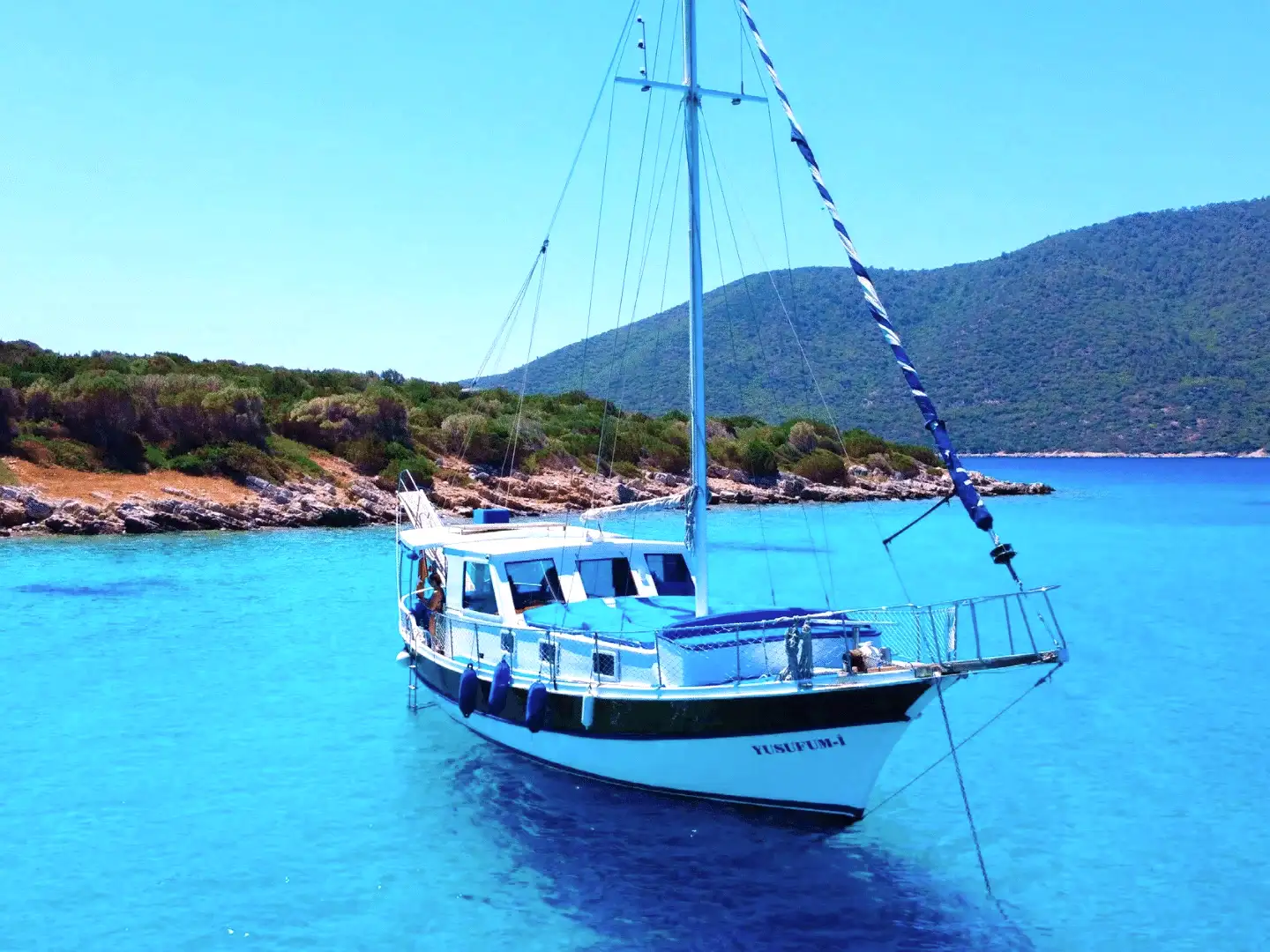 İhtiyaçlarınızı karşılayabileceğiniz tuvalet ve rahatlıkla giyinebileceğiniz giyinme odası bulunan guletimiz toplam 12 kişilktir. Dileyen misafirlerimiz istirahat etmek için odayı kullanabilirler. İstediğiniz müzikleri dinleyebileceğiniz müzik sistemimiz mevcuttur. Wi-Fi olanağında bulunan teknemiz Bodrum'un en eşsiz koylarında sizlere gün boyu hizmet vermeye devam edecektir. Dalış ekipmanlarımızdan yararlanabilir, Bodrum Denizinin muhteşem canlılarıyla birlikte yüzme olanağını deneyimleyebilirsiniz. Olta tanımı ile keyifli dakikalar yaşayabilir farklı tecrübeler edinebilirsiniz. İhtiyacınız doğrultusunda sizin için özel olarak hazırlanmış olan plaj havlularını temin edebilirsiniz. Mavi turdan yorulan misafirlerimiz ihtiyaç halinde mide rahatlatıcı hap ve ilk yardım malzemelerimizi deneyimli ekibimizden isteyebilirler.